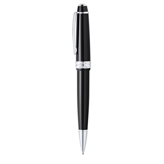 Kugelschreiber Cross Bailey Light, kombiniert ein hochglänzendes Harz mit einem polierten Chrom, metallisches Finish. Jumbo-Patrone in schwarzer Tinte. Präsentiert in einem eleganten, schwarzen Etui mit Markenlogo und weichem Wildlederfutter.