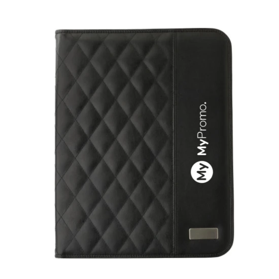 Konferenzmappe aus PU, ca. DIN A4-Format, mit 4 Einsteckfächern, Stifthalter (ohne Stift), Metallplätchen für Gravuren und Schreibblock mit 25 linierten Blättern