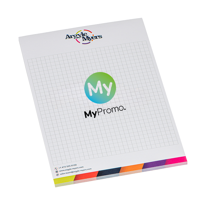 Notizblöcke A5. Einfarbig bis vierfarbig auf jede Seite gedruckt. Kopf an eine graue Kartonrückseite geleimt.