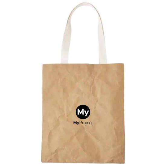 Papiertragetasche mit PE-Laminierter Innenseite und Griff aus einer Polyester/Baumwollmischung.