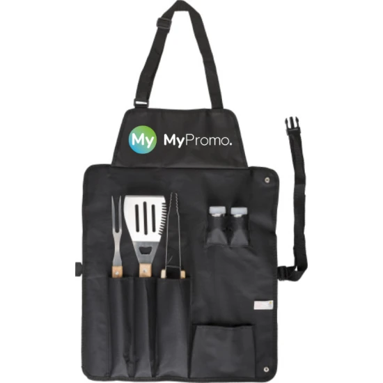 Nylonschürze (600D) mit fünfteiligem Grillset aus Edelstahl, bestehend aus: Tranchiergabel, Pfannenwender, Zange, Ofenhandschuh sowie Salz- und Pfefferset.