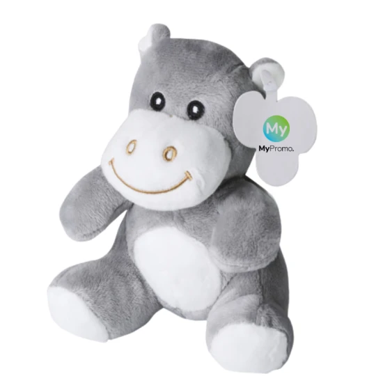 Nilpferd aus Plüsch. Mit gestickten Augen. Enthält einen Anhänger zum Bedrucken.