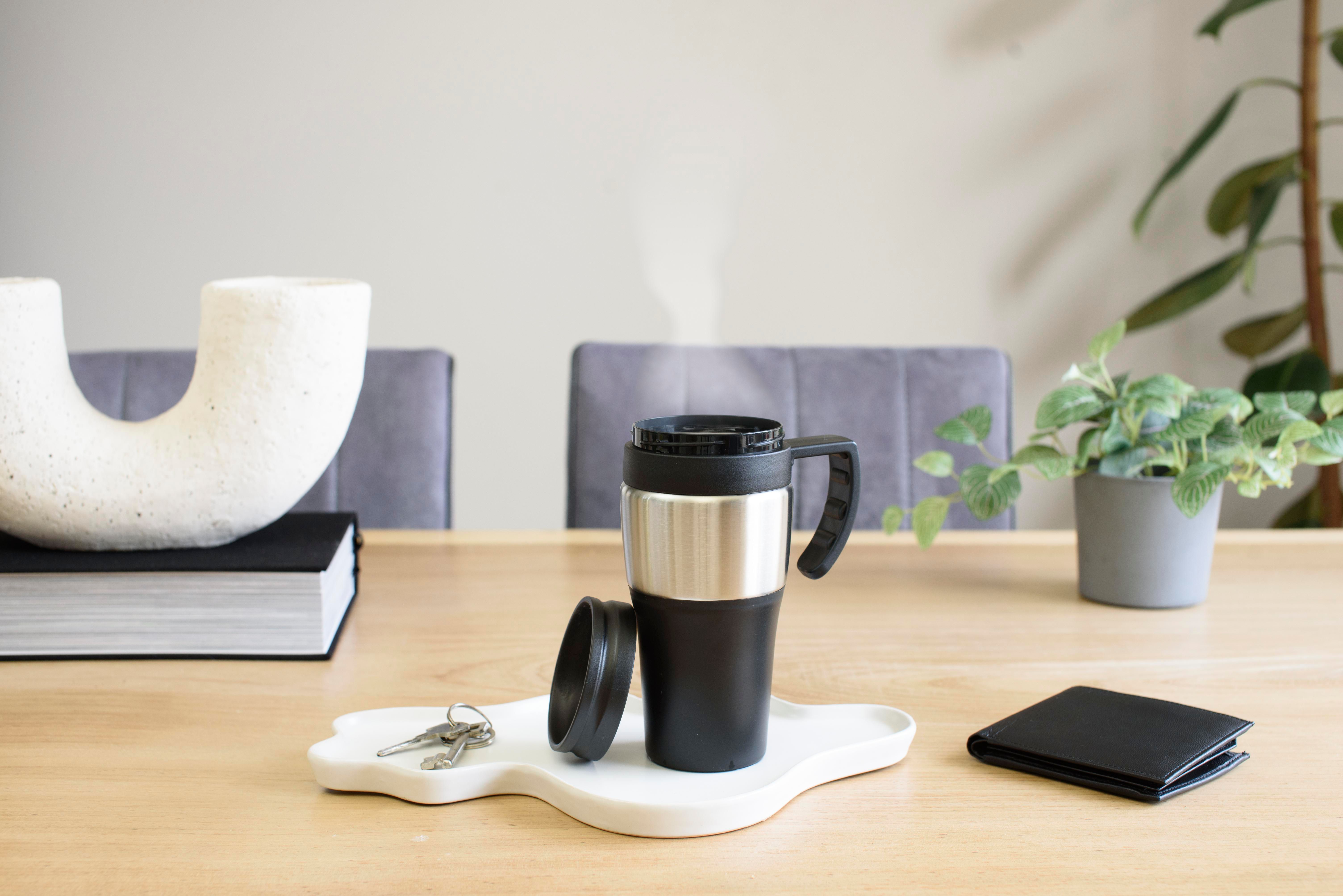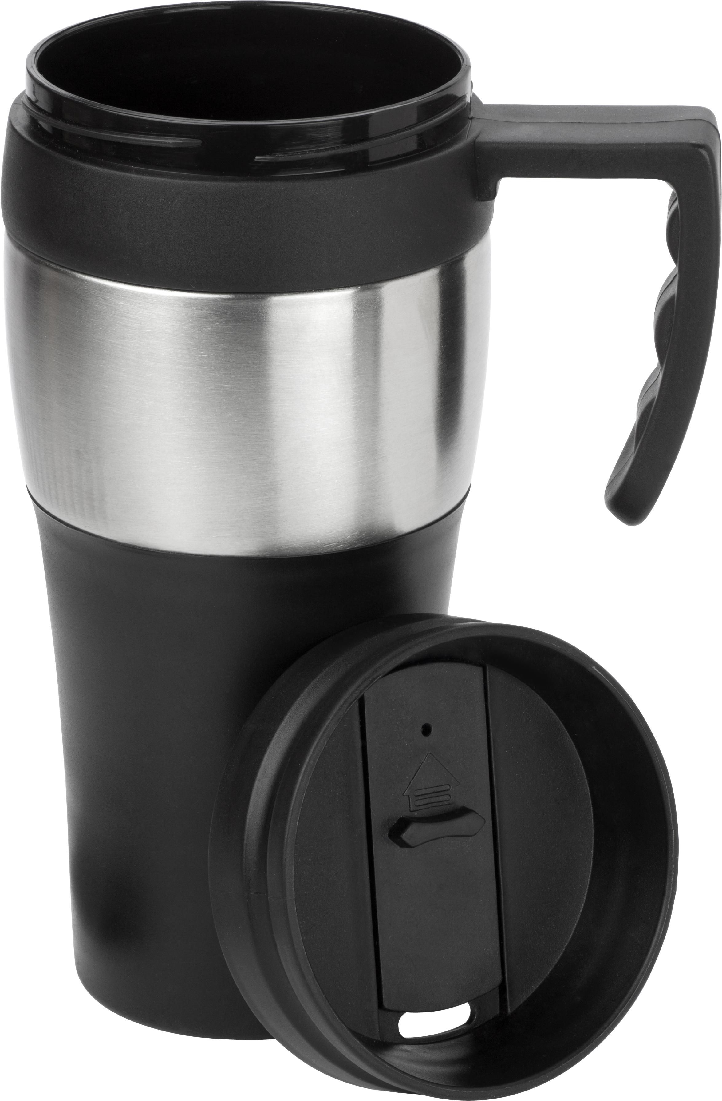 Praktischer Reisebecher aus Edelstahl und PP mit 500 ml Fassungsvermögen. Der Deckel verfügt über eine Trinköffnung, die mit einem Schiebverschluss sicher geschlossen wird—ideal für unterwegs und den täglichen Gebrauch.