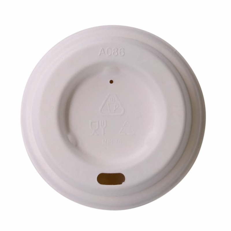 Ökologischer weißer Deckel aus biologisch abbaubarer Bagasse für Pappbecher mit Heißgetränken. Nicht personalisierbar. Für Becher mit einem Durchmesser von 8 cm.